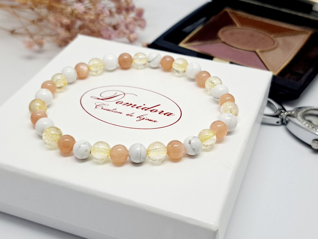 La citrine, pierre de la joie de vivre est ici associée à d’autres pierres naturelles, la pierre de soleil et la howlite.